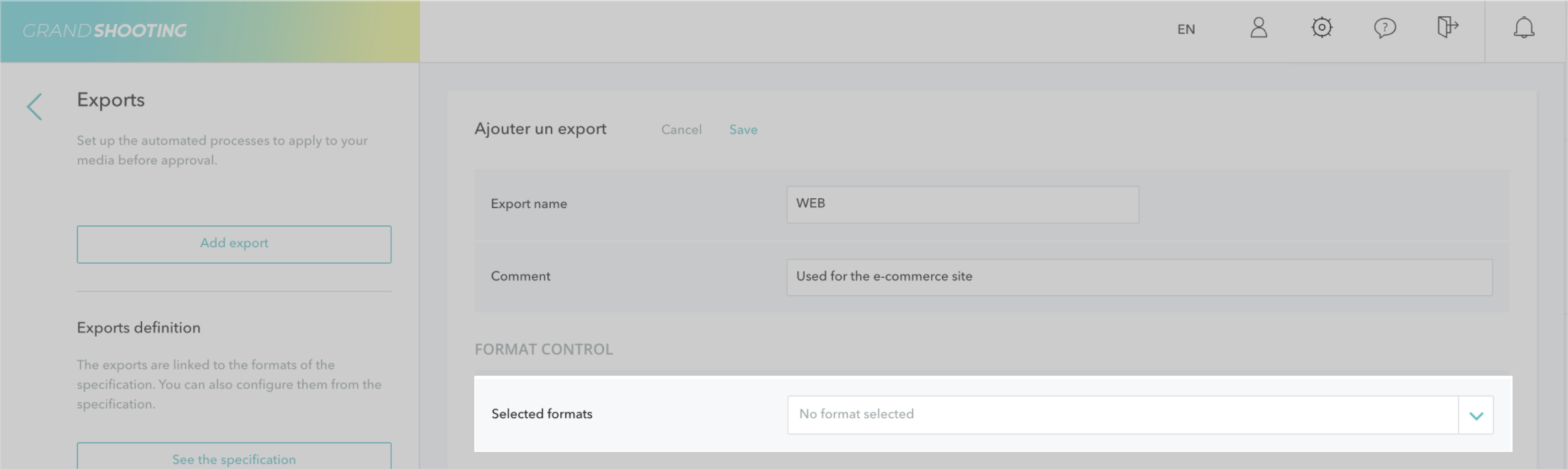 In simple cases, the same formats are expected for all views, regardless of the product categories. For example, if each file is expected in an HD (high definition) and BD (low definition) format, it is very simple to create 2 HD and BD exports that will apply to all files. The exports can automatically generate the BD format from the HD loaded in phase 1 of retouching.