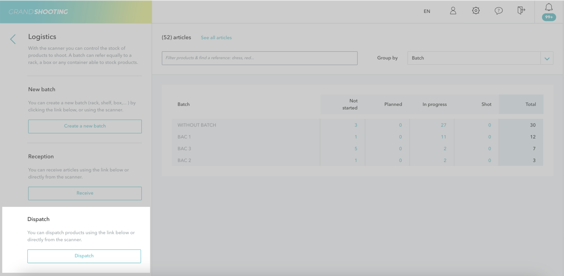 L'expédition est l'opération inverse de la réception : les articles sont scannés un à un puis marqués expédiés pour signifier qu'ils quittent le studio photo. Les articles passent alors au statut Expédié.