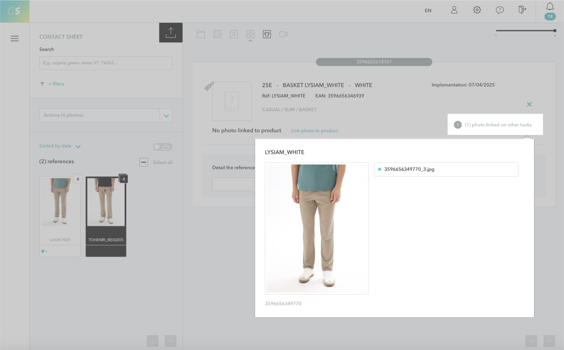 Dans la banque d'images, en faisant une recherche sur une référence présente dans un look, vous retrouvez tous les fichiers sur lesquels apparaît le produit, même s'ils ne sont pas nommés avec la référence recherchée. Pour voir tous les fichiers, activez la fonctionnalité Looks associés.